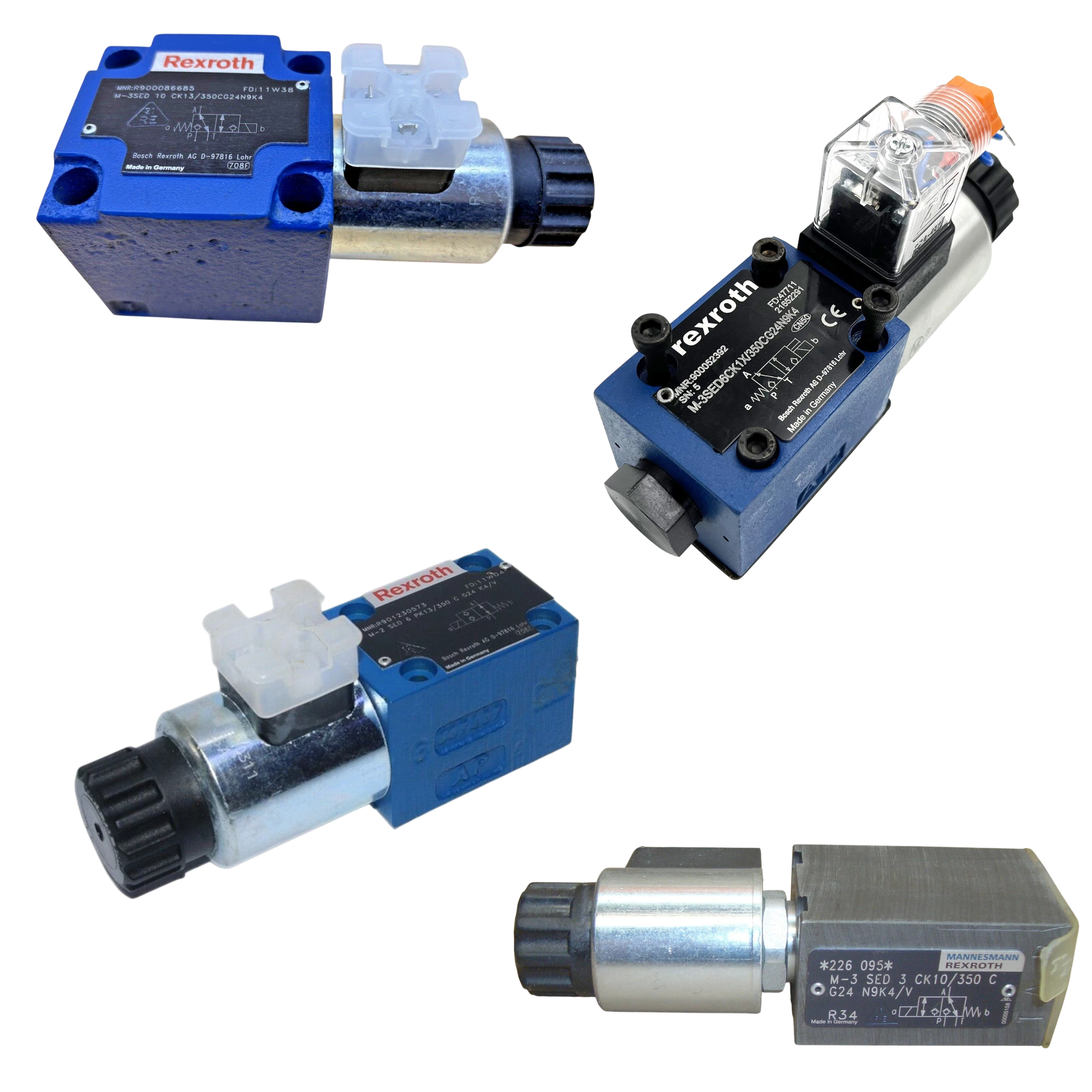 The Bosch Rexroth Type M-SED are direct operated, solenoid-actuated directional poppet valves used in hydraulic systems, available in 3/2 and 4/2 configurations. Their primary function is to reliably control the start, stop, and direction of fluid flow for applications requiring up to 40 l/min. The valve's operation relies on a spring and a solenoid to press a closing element onto seats, which ensures a leak-free blocked port in the closed position. These robust valves are rated for a maximum operating pressure of up to 350 bar for all main ports. A 4/2 directional poppet valve function is achieved by mounting a 3/2 valve in conjunction with a specialized sandwich component called the Plus-1-Plate.