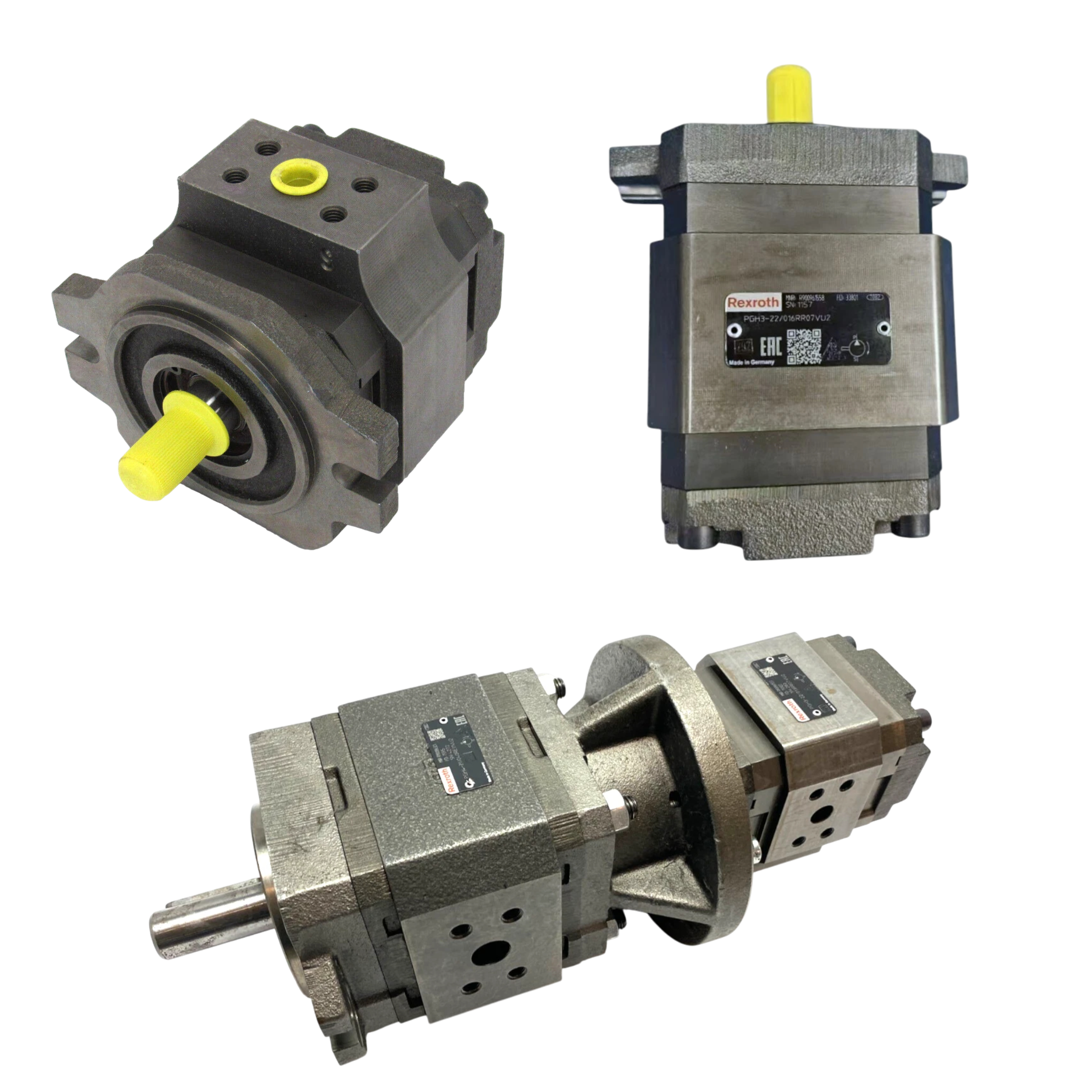 The Bosch Rexroth PGH High Pressure Gear Pump is a fixed displacement pump designed for high pressure hydraulic applications, featuring a maximum operating pressure of 350 bar. It operates with notably low operating noise and low flow pulsation, making it suitable for a broad range of viscosities and speeds. The pump achieves high efficiency, even at low speed, due to an internal design that incorporates sealing gap compensation. This design ensures a long service life and consistent performance by minimizing internal leakage. The primary function of the PGH pump is its use in fatigue-endurable drives with high pressure and load cycles, commonly found in plastics processing machines, presses, and test stands.