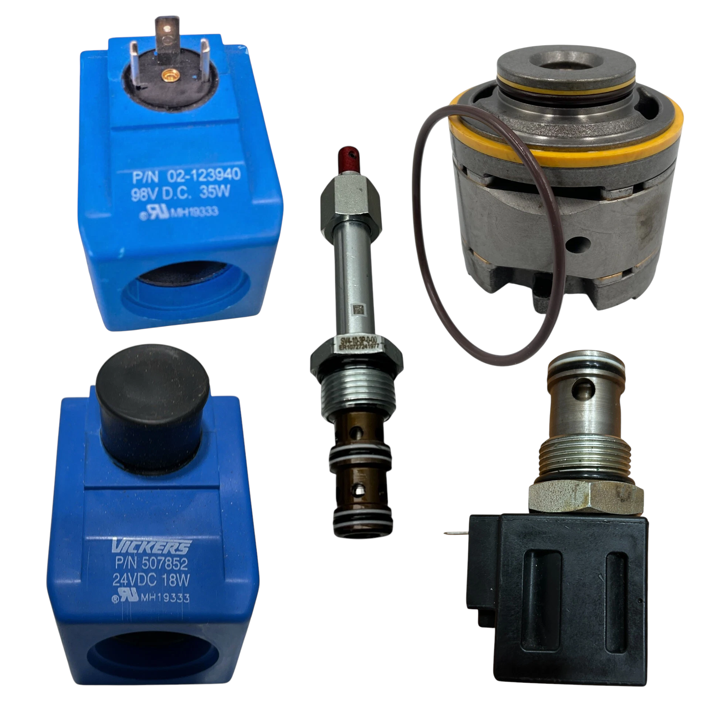 Vickers' extensive range of Hydraulic Accessories provides essential supporting components to optimize, maintain, and repair fluid power systems. This line includes critical parts such as solenoid coils and electrical connectors for valve actuation, various replacement cartridge kits for pumps and motors, and a wide array of filters and accumulators. These high-quality spares and complementary components are necessary for maintaining performance and extending the service life of core Vickers pumps and valves.